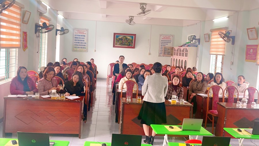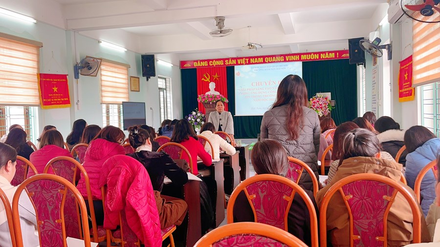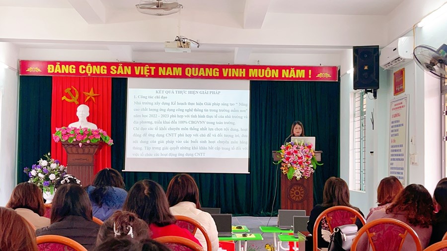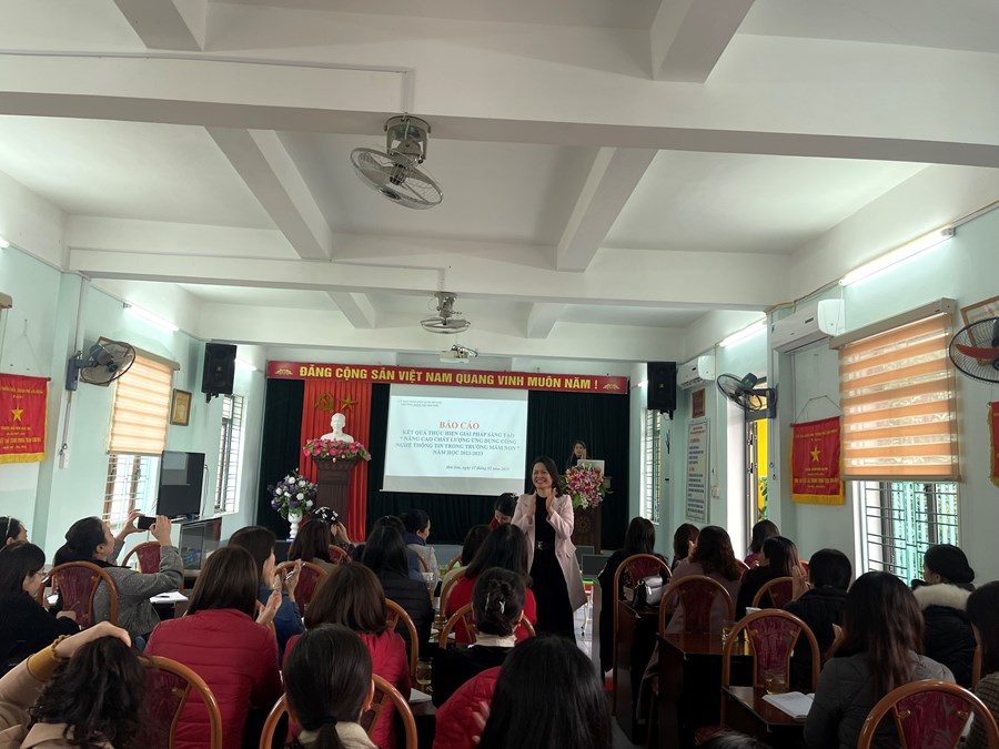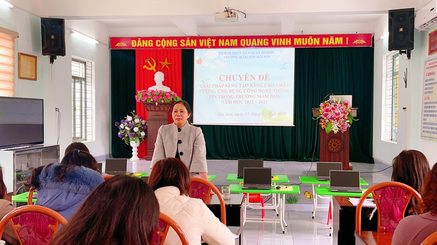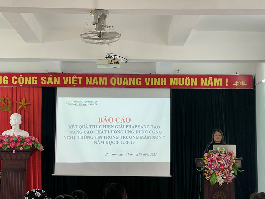 Ngày 17/02/2023 Trường Mầm non Hải Sơn Tổ chức Chuyên đề Báo cáo kết quả thực hiện Giải pháp sáng tạo " “ Nâng cao chất lượng ứng dụng Công nghệ thông tin trong trường mầm non" năm học 2022- 2023