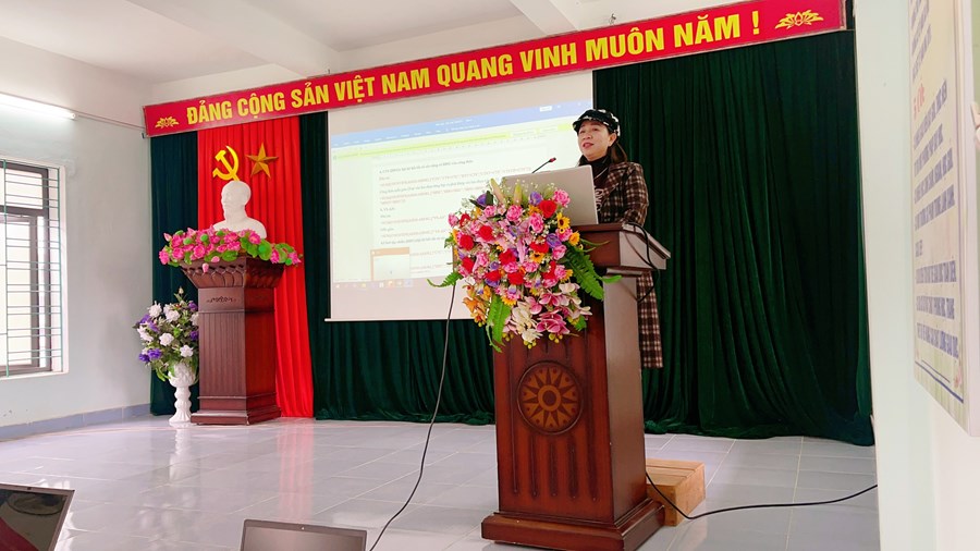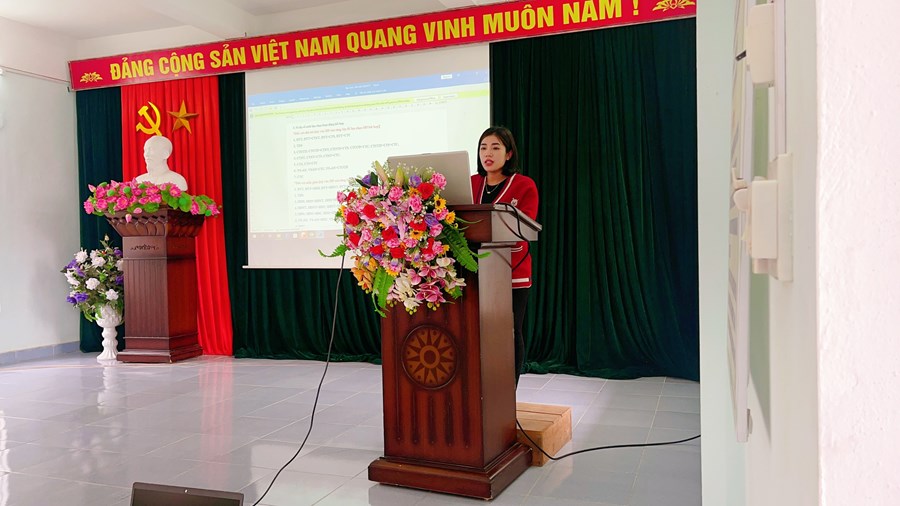 Đ/c Nguyễn Thị Thuý - Phó Hiệu trưởng nhà trường báo cáo kết quả thực hiện Giải pháp sáng tạo " Nâng cao chất lượng ứng dụng CNTT " của nhà trường năm học 2022-2023