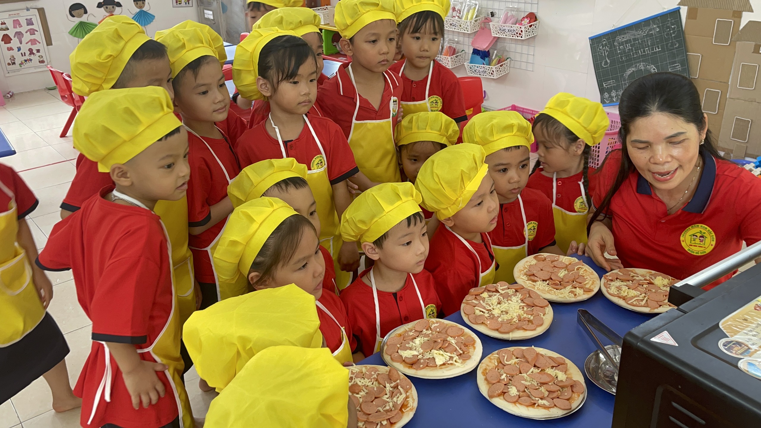 Các bé rất hào hứng khi được tự tay chuẩn bị xúc xích, phô mai và những món mình thích để làm chiếc bánh piza cho riêng mình. Với sự chuẩn bị chu đáo và hướng dẫn của cô giáo, các bé đã tự tay làm cho mình những chiếc bánh pizza thơm ngon nóng giòn.