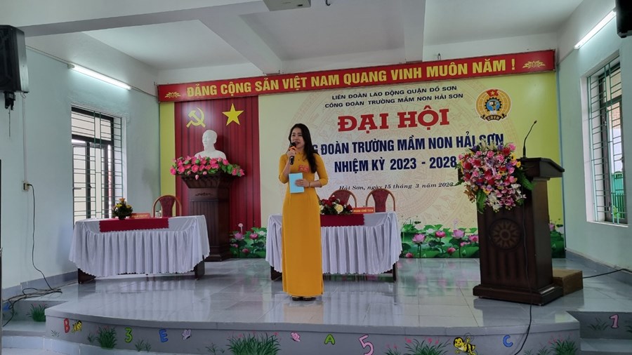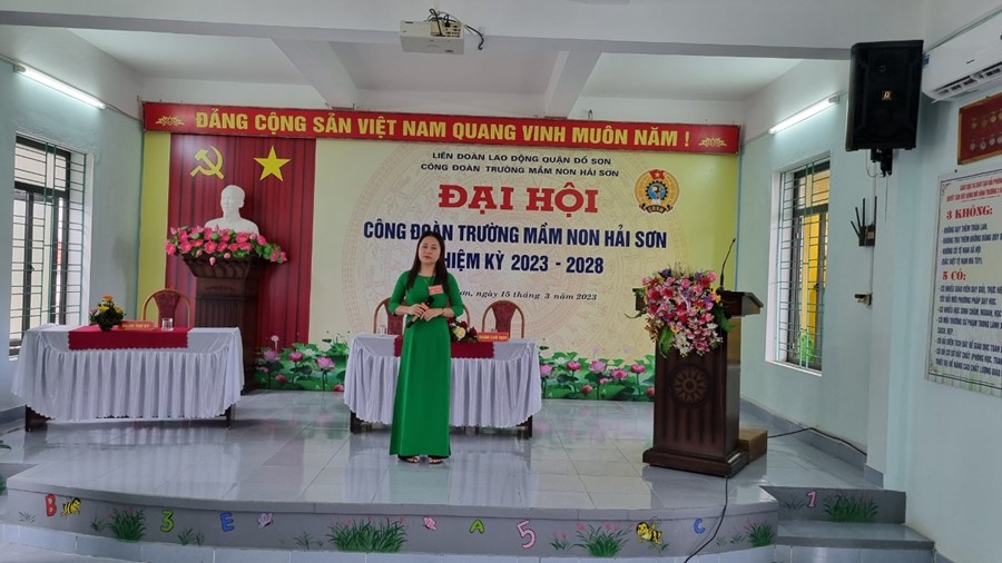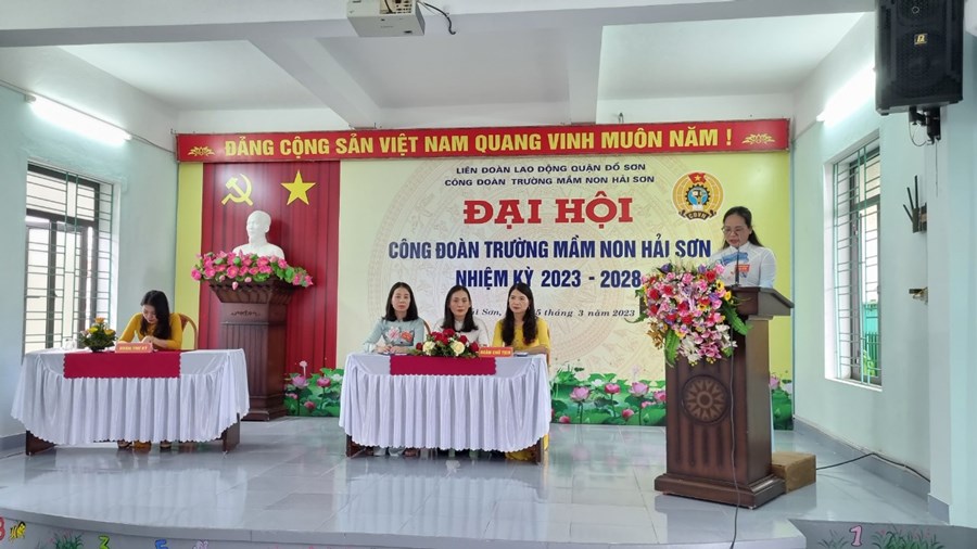 Đ/c Lưu Thị Thuỳ Dung thay mặt Đoàn chủ tịch Đại hội báo cáo Đề án nhân sự bầu Ban Chấp hành Công đoàn trường Mầm non Hải Sơn nhiệm kỳ 2023-2028, đại biểu đi dự Đại hội Công đoàn quận Đồ Sơn lần thứ VIII nhiệm kỳ 2023-2028.